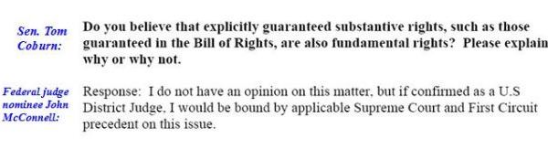 McConnell’s views on the Constitution are also extremely troubling. In written questions that were part of McConnell’s confirmation hearings, Senator Tom Coburn (R-OK) asked the nominee if he believed the Second Amendment and the Bill of Rights protected fundamental rights. McConnell responded evasively and refused to declare what he considered to be fundamental, individual liberties.