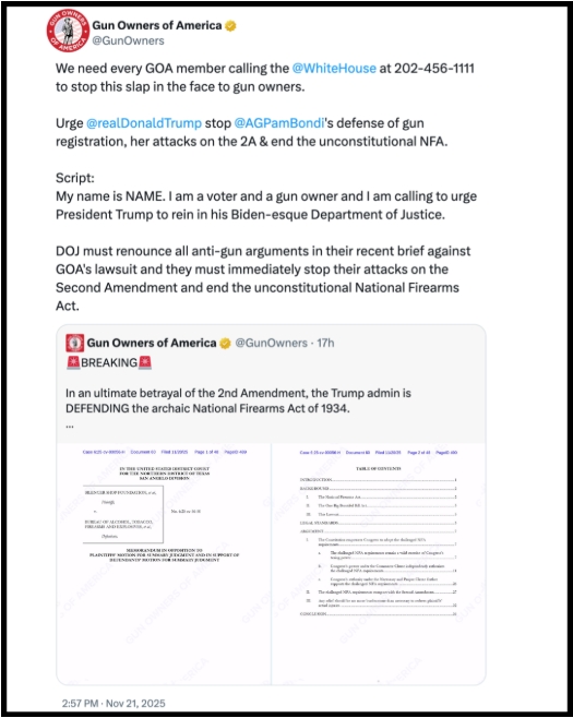 In a stunning, ultimate betrayal of the Second Amendment, the Department of Justice responded to GOA’s One, Big, Beautiful lawsuit with a new attack on gun owners. The Trump administration is now actively DEFENDING the archaic National Firearms Act of 1934 using legal arguments straight out of the FDR playbook.