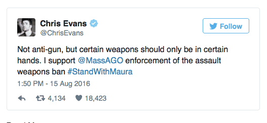 That profile pic might not look like the blond-haired, blue-eyed actor who plays the misguided hero in the not-so-marvelous flick Captain America: Civil War. But that be he: actor Chris Evans. In the movies, Cap wields a .45, albeit briefly. In real life, Mr. Evans is against “assault weapons.” To the point where he felt compelled to Tweet his support for MA AG Maura Healey’s midnight raid on residents’ right to keep and bear their choice of arms.